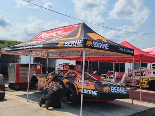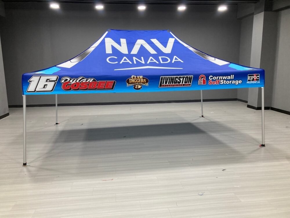 EPIC Racewear custom canopies are portable pop-up tents designed for race weekends, outdoor events, and trade shows across Canada and the US. Built with full-color dye-sublimation, they deliver bold, durable graphics on the roof, valances, and optional sidewalls for 360° visibility.